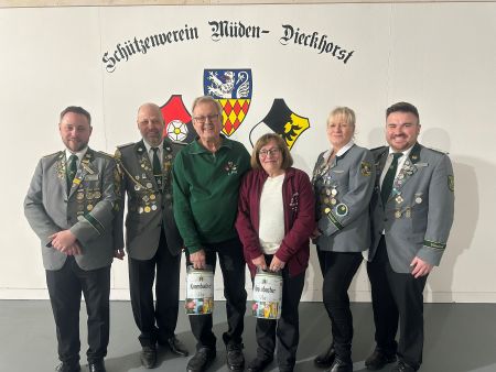 (von links: Schießwart Björn Schlepps, Schießsportleiter Henning Meier, Hans-Dieter Peters, Sieger Erich Holz, Carolin Stockmann-Meyer, Schießwarte Melina und Nicklas Meyer)